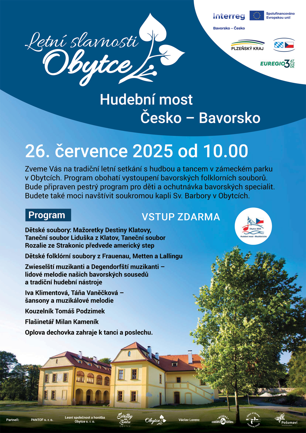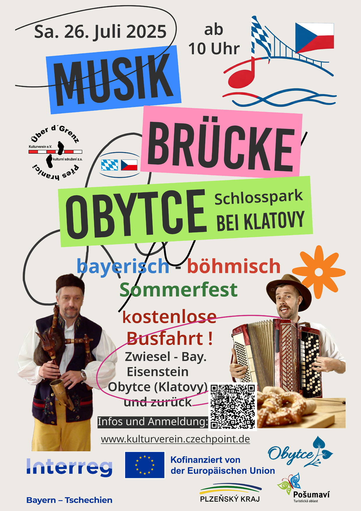 Hudba staví mosty – přes vodu i mezi zeměmi. To zjistili všichni účastníci, kteří se v deštivou sobotu vydali ze Zwieselu na „Hudební most Obytce“, nádhernou akci v zámeckém parku v malém městečku Obytce nedaleko Klatov. Pozvání vyšlo od kulturního spolku Über d‘Grenz ze Zwieselu, který jako partnerský spolek TO Pošumaví spolupořádal tento hudební festival.